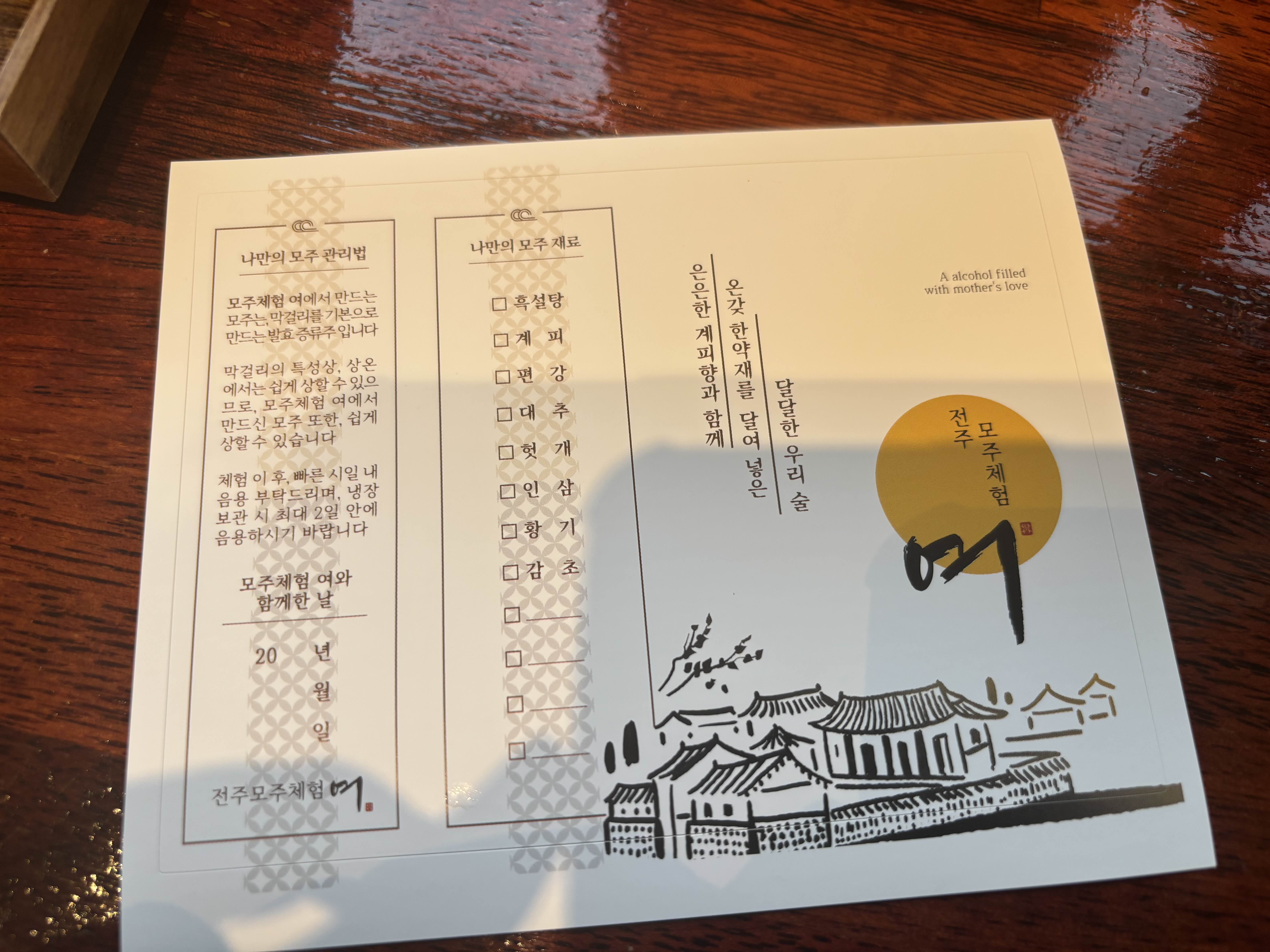 ✔️ 모주는 알코올 도수가 매우 낮거나 거의 없는 편이지만, 운전하실 분은 확인 후 체험하는 걸 추천드려요.