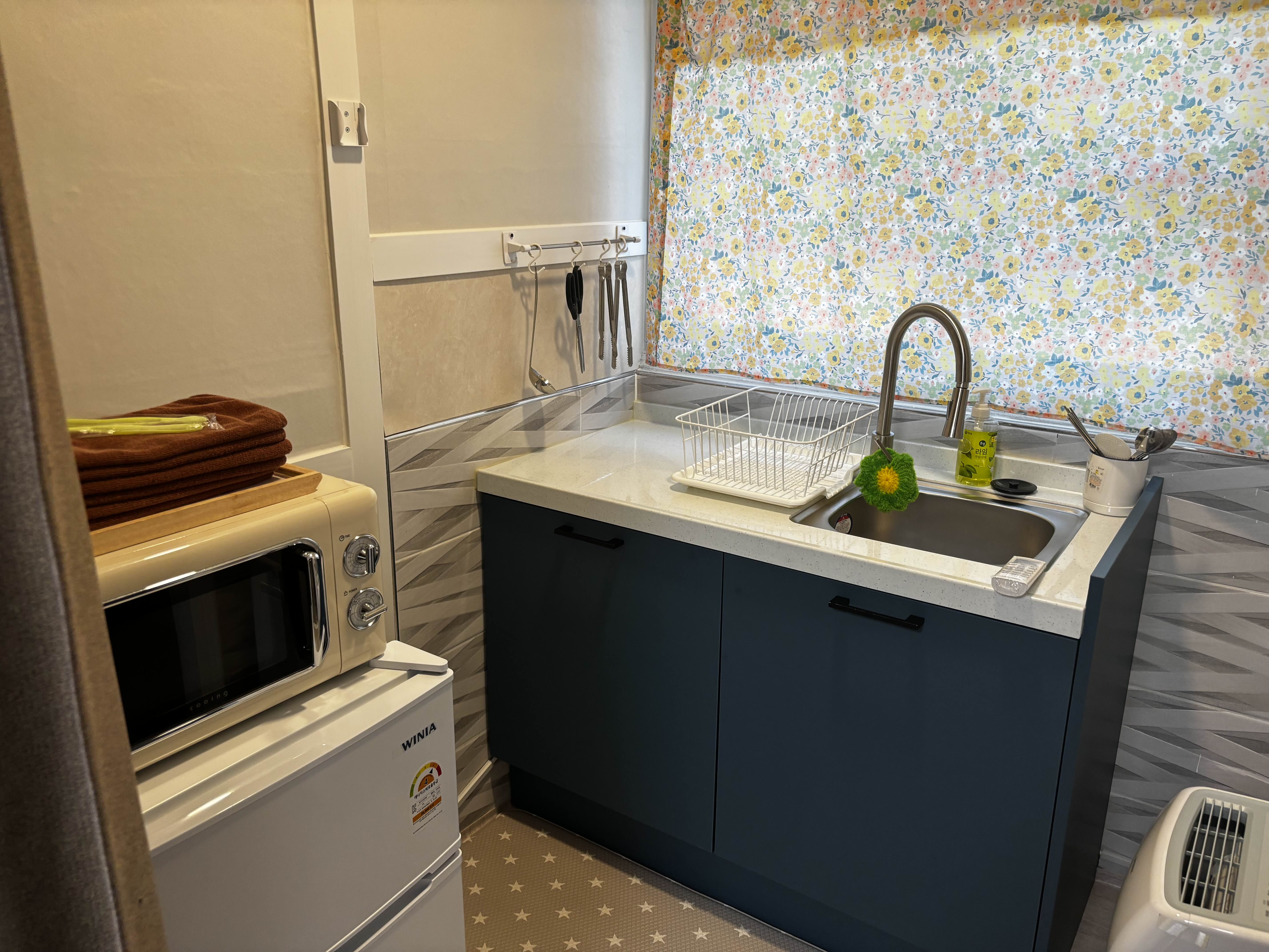 침대, 테이블, 냉장고, 전자레인지, 식기류, 커피포트 등 기본적인 편의시설이 모두 잘 갖춰져 있었고,